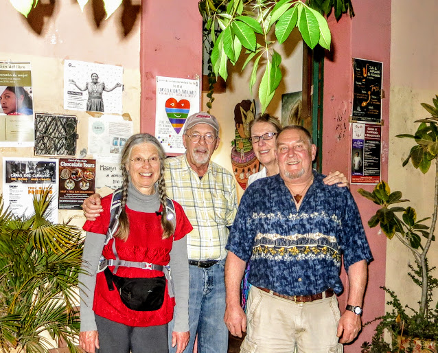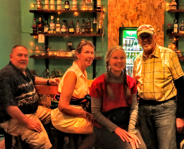 Monday, Monday....Dinner with Sandra, Lynn, and her husband Kurt at the popular Quinque Restaurant. I brought some box wine for us as they do not have a liquor license. Just after I arrived so did they. It was a packed house so we ate upstairs. They had the Shrimp and I had the Fresh Shark. It was all good but I forgot to take photos again. I caught my friend Peter as he was finishing his dinner and enlisted him to take a photo of us.