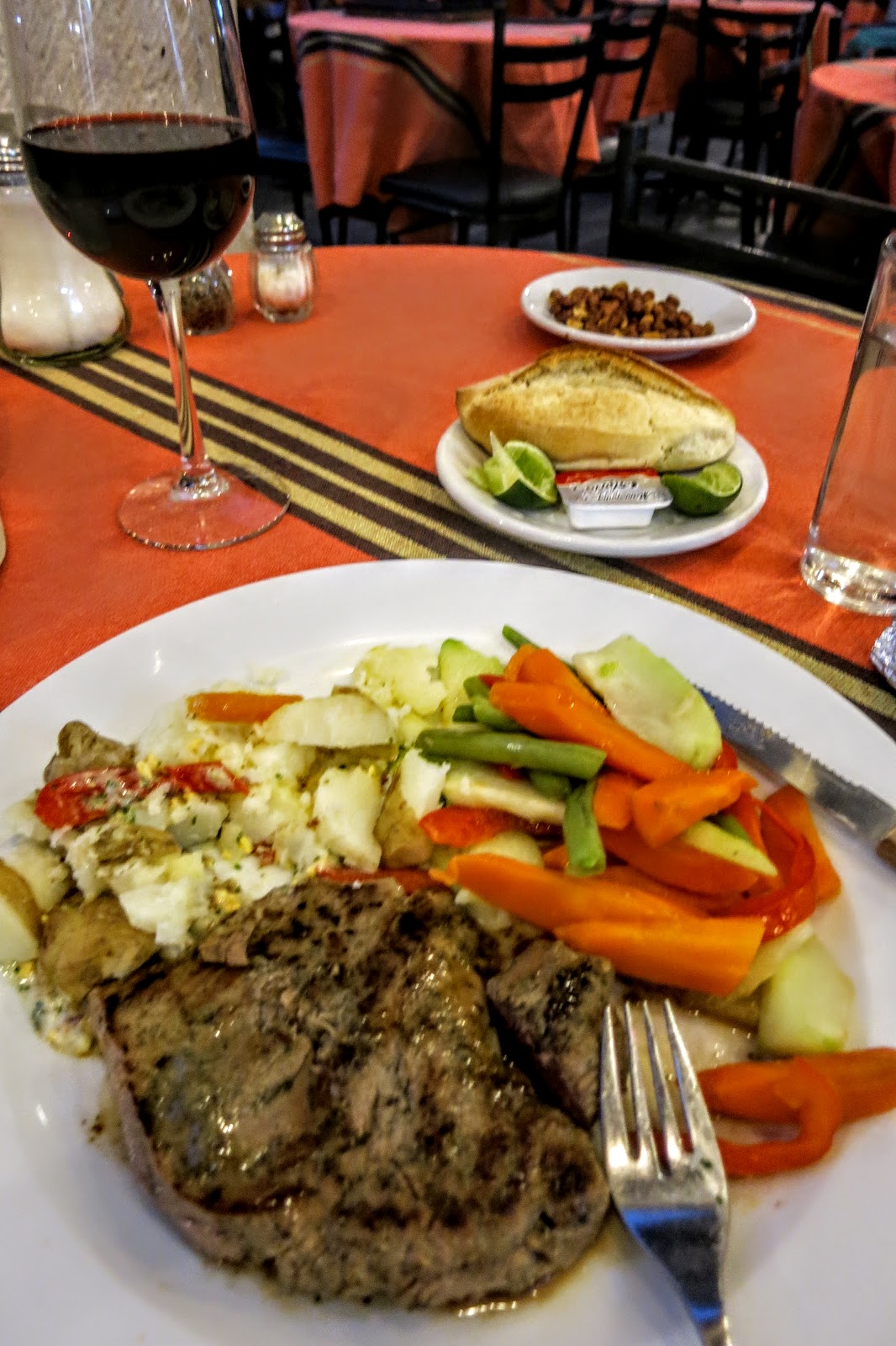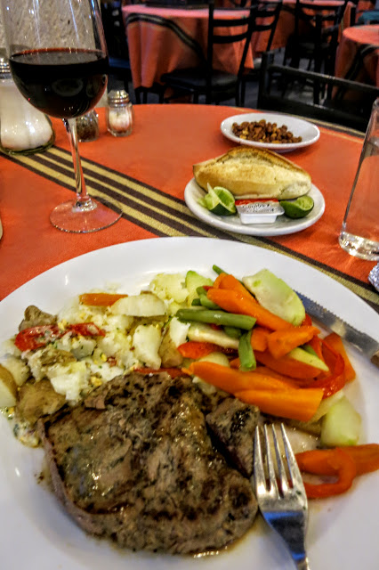 I went to pick up the photos but it's Mexico...Manana. So I working on my Google Photo albums all afternoon and are getting ready to venture out to the Zocalo to read and relax with some Vino Tinto. It is a beautiful Monday evening as I arrived at Importado to the welcome of three of some the best waiters in Oaxaca. They, (work as a team) had me comfortable with a glass of water and my wine in short time. I discovered my Canadian friend Darcy arrived back from his visit with his Mom about two days ago. The report is he was struck by a car but didn't remember a thing. I hope to see him soon. I finally broke down and ordered a steak Medium Rare with Veggies and Potato.